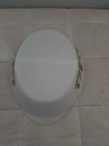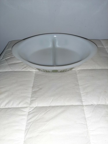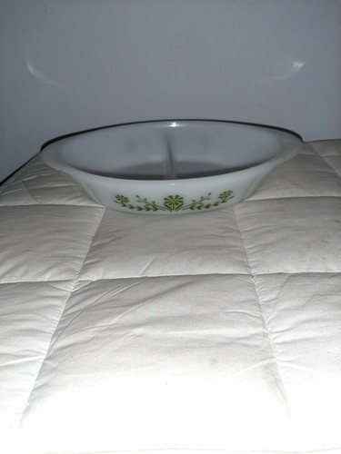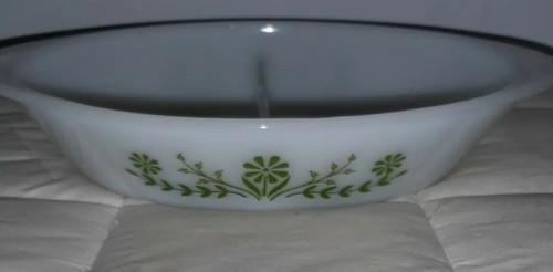 Vintage Oval Jeanette Glasbake Green Crazy Daisy Divided Casserole Dish. There are no markings on the bottom of this dish.