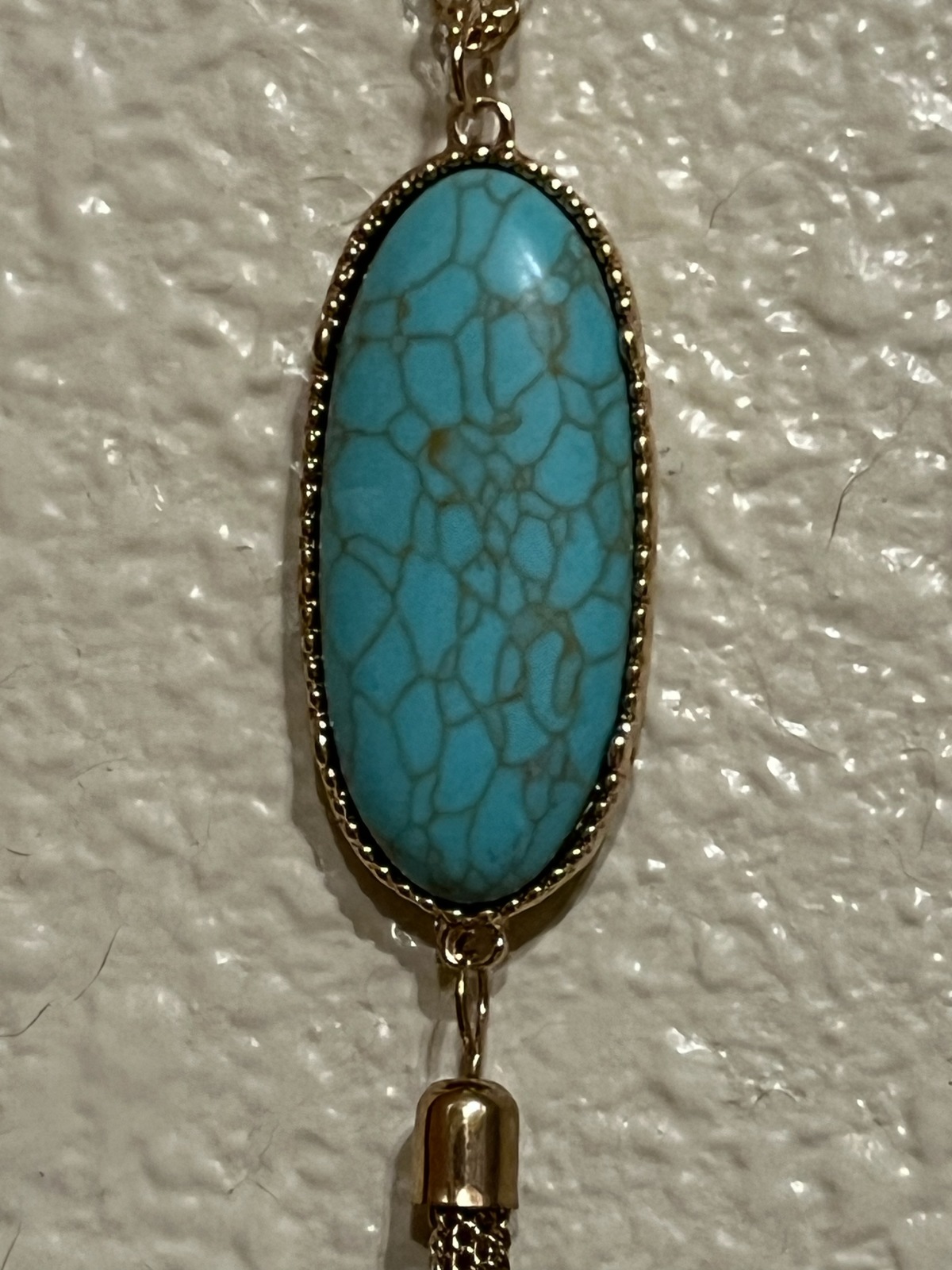 A Turquoise created elongated pendant mounted in a gold fancy setting. The pendant has a gold tassle dangling off the bottom of the pendant. A Sautoir 19 inch adjustable gold chain, is included. There is something very charming about a turquoise given by a loving hand that carries with it Happiness and Hope. Go for the Turquoise tranquility and capture the seas dreamy palette.