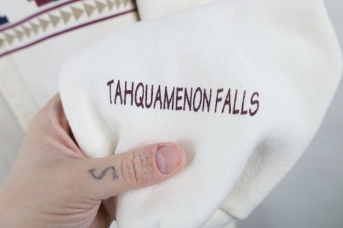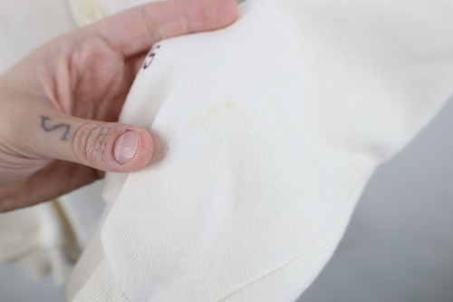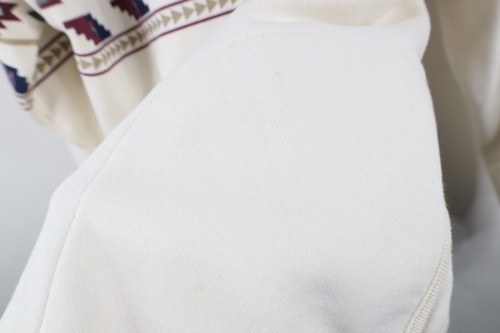 Stains throughout, collar and right cuff. Collar, cuffs discolored. Graphics faded. Pilling. Made in USA