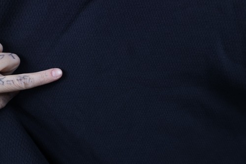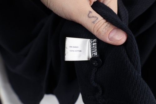 Hole front top. Blemises/dark spots front. Discoloring collar, cuffs, throughout. Color faded. Pilling. Loose threads bottom hem, collar