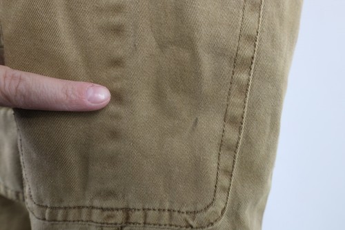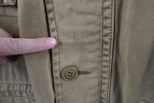 Missing second to bottom button. Stains front middle and bottom, back left arm. Color faded