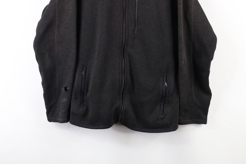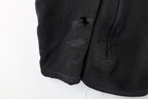 Thrashed. Holes and stains right arm and cuff. Fabric pulls by both pockets, on collar. Color faded. Has pilling