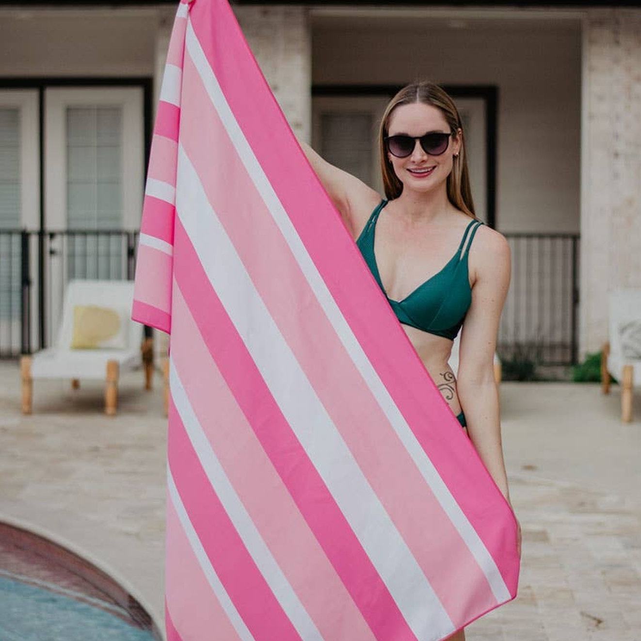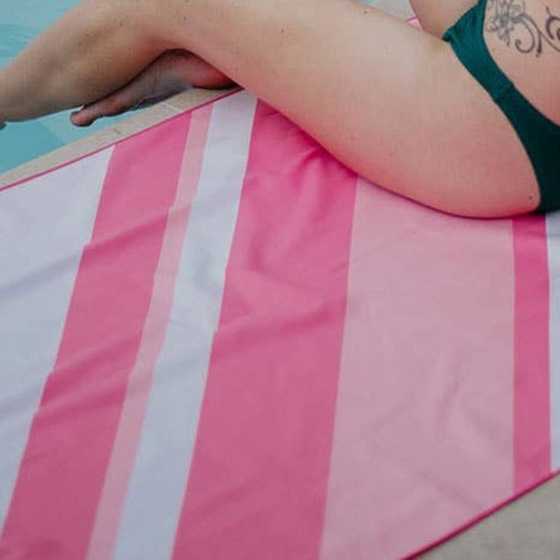 If you're looking for a towel that's both chic and practical, look no further than our pink striped quick dry towel. Made from 100% microfiber, it's perfect for the beach, pool or any vacation. Plus, it comes in a small carry pouch so you can take it with you wherever you go. 100% microfiber 63? x 31? compact; comes in small carry pouch wash cold or warm, tumble dry low or no heat sand-free quick drying