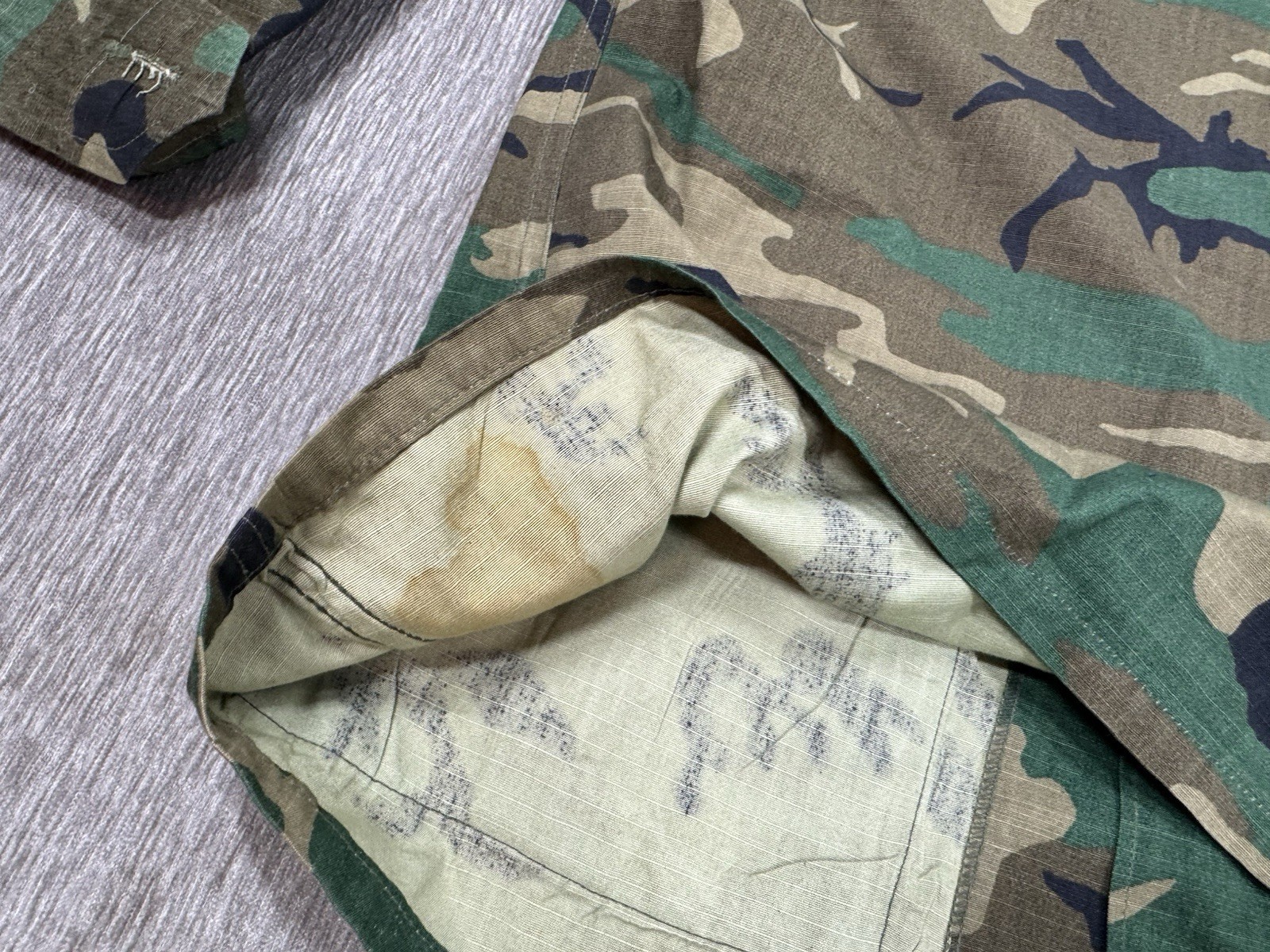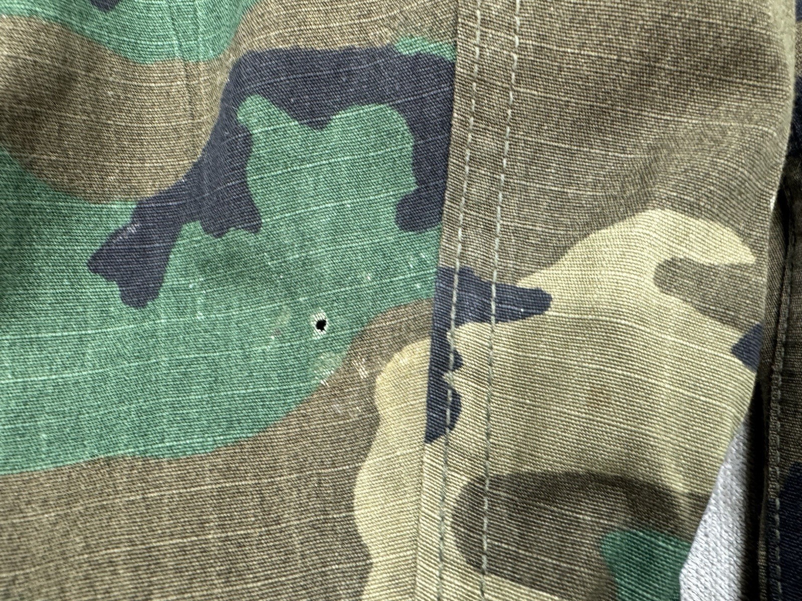For sale is a vintage US Military Woodland Camo Hot Weather Combat Coat Top Ripstop - dated 1980.