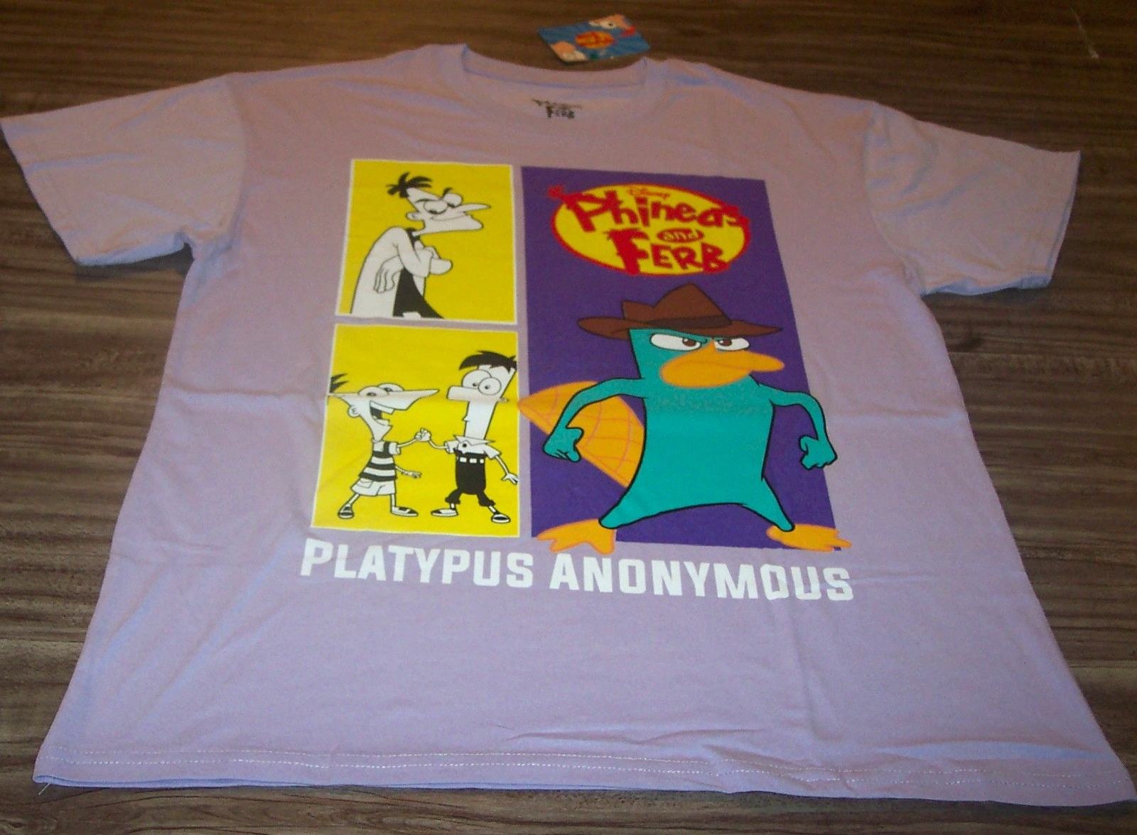 This is a Walt Disney Phineas Ferb PLATYPUS ANONYMOUS T-shirt. It is a size LARGE and it is NEW with the tag. It is 22 inches from armpit to armpit and 29 inches in length. Combine items to save on shipping. AD