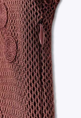 Midi maroon pink dress with a round neck and long puff sleeves with elasticated cuffs. Featuring embroidery detail and a matching fabric combination. Back fastening with opening and button.