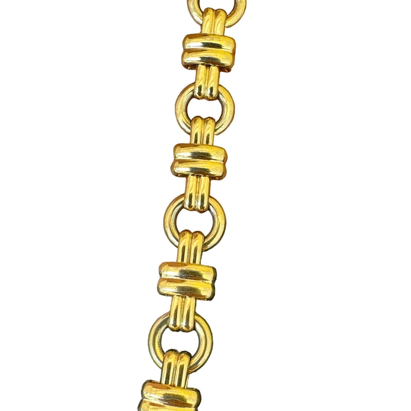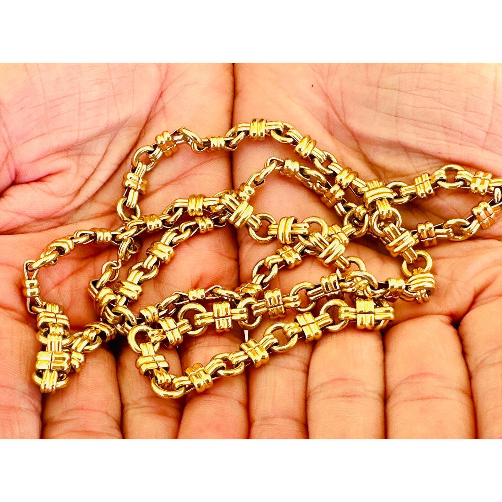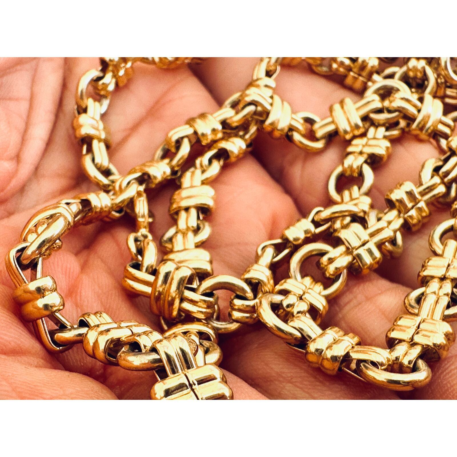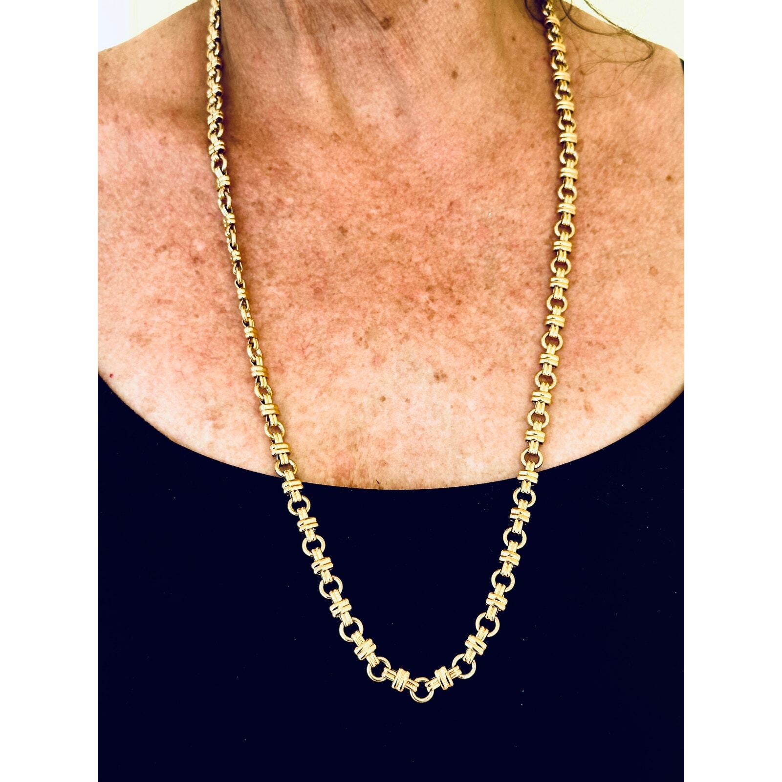 Vintage heavy circle link chain. 29" long....Made in gold-tone metal and might be gold-plated, but it is not marked. Has a spring ring clasp. The necklace is signed TRIFARI TM near the clasp. From the 80s. In excellent condition, no wear at all..