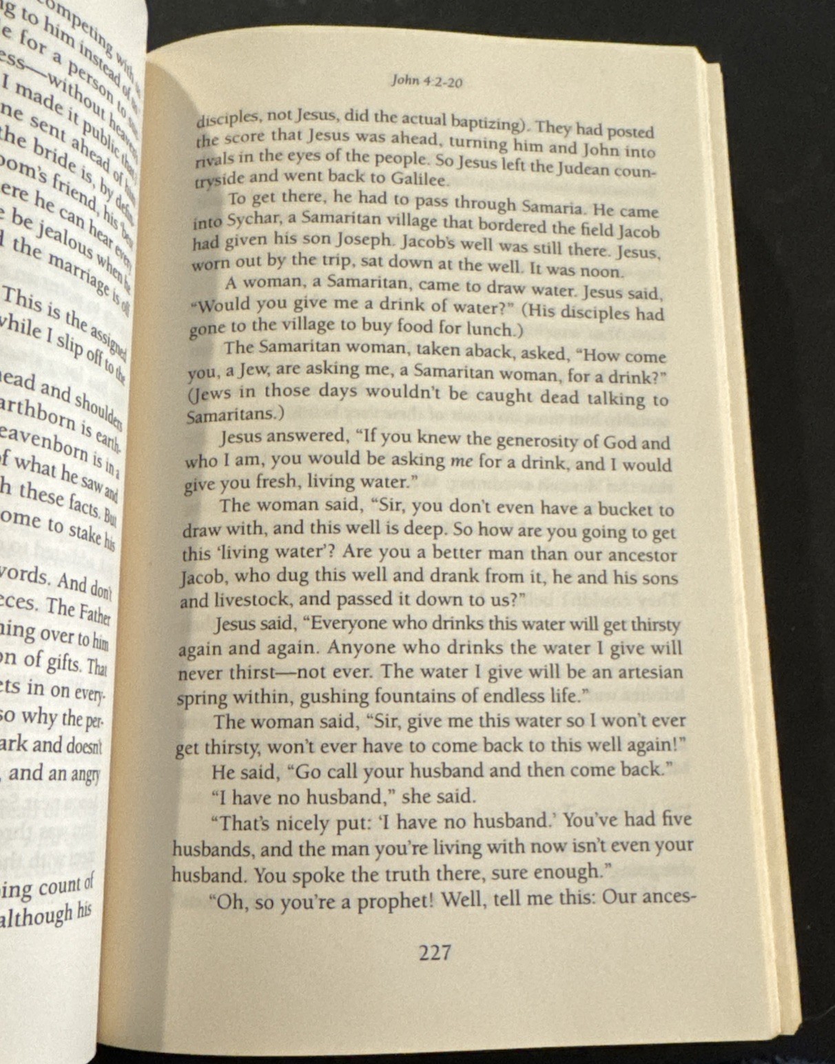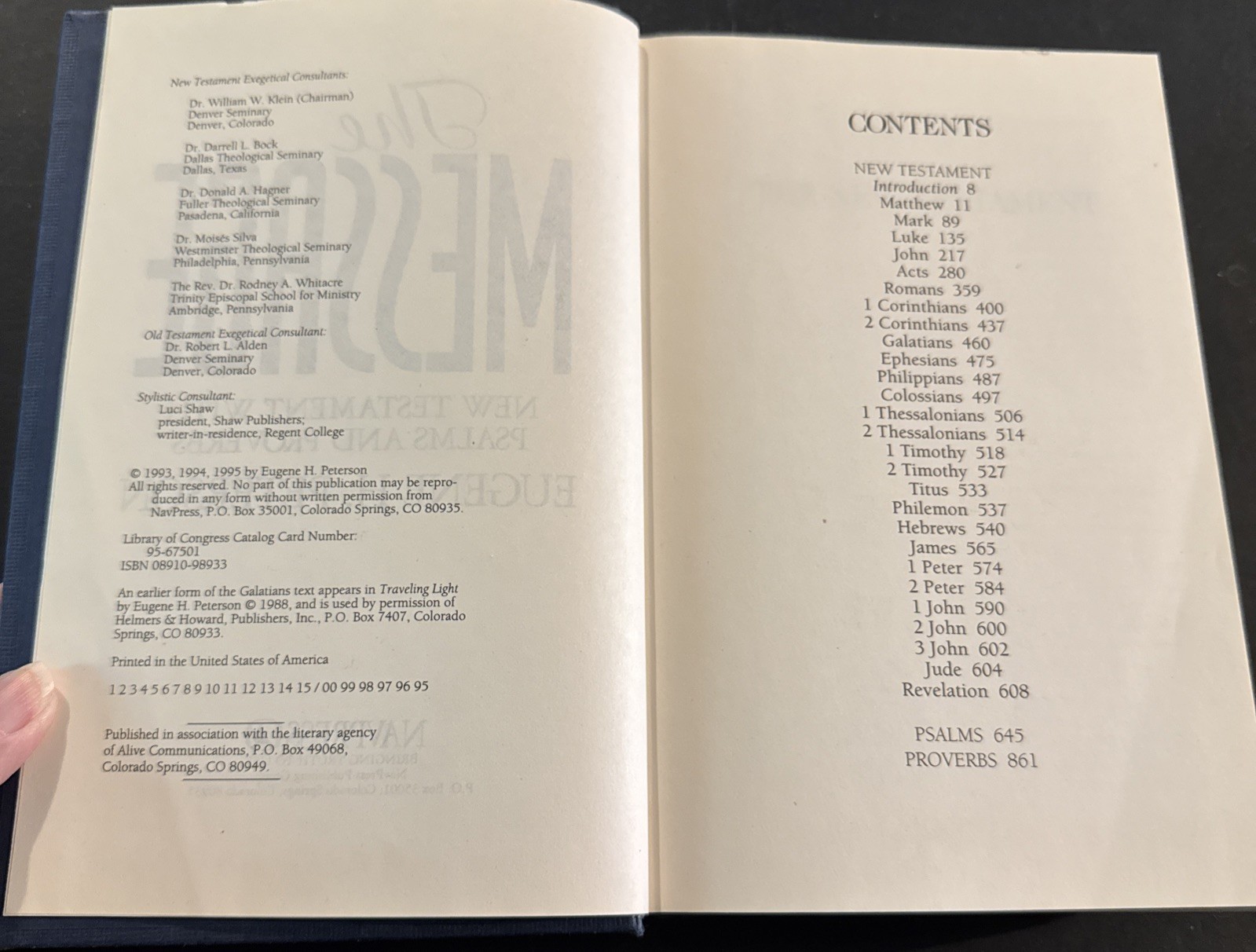 "The Message" is a contemporary language Bible published by Tyndale House Publishers in 2005. This first edition hardcover book, with 1728 pages, is illustrated and written by Eugene H. Peterson. It is designed for a wide audience including young adults, ages 9-12, and adults. This Bible, with its modern language and illustrations, offers a fresh and accessible interpretation of the text, making it a valuable resource for readers looking to engage with the scripture in a contemporary context."