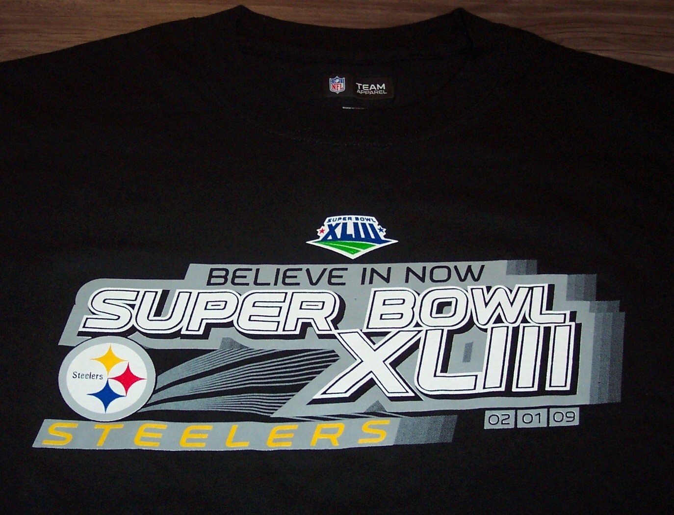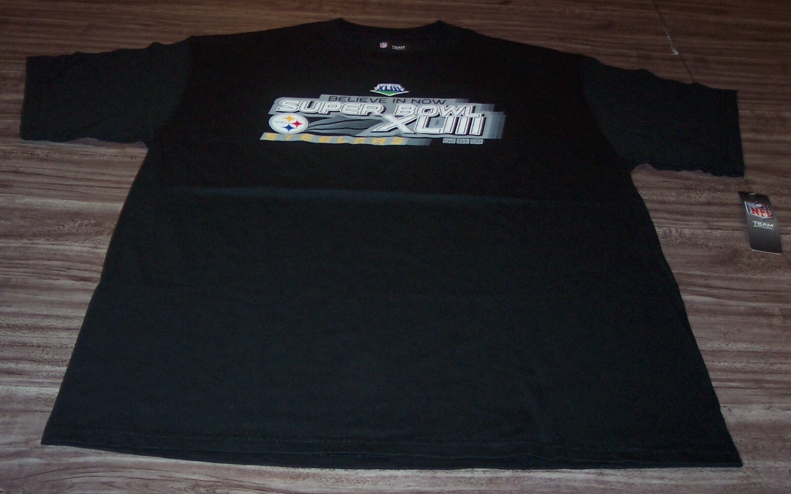 This is a PITTSBURGH STEELERS NFL SUPER BOWL XLIII "Believe In Now" T-Shirt. It is a size XL, and it is NEW w/ TAG. It is 24 inches from armpit to armpit and 32 1/2 inches in length. It is an official NFL TEAM APPAREL Shirt. Combine auctions to save on shipping. AG