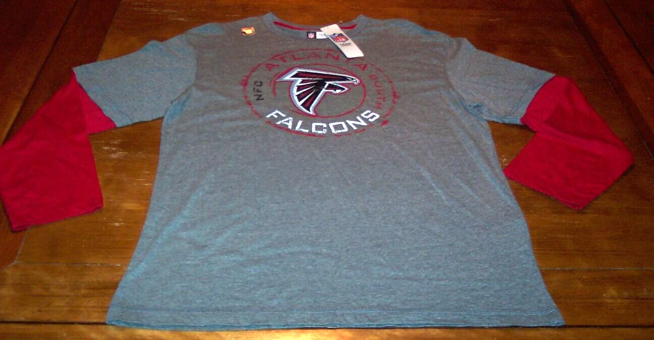 This is a VINTAGE STYLE ATLANTA FALCONS NFL FOOTBALL Long Sleeve T-Shirt. It is a size LARGE and it is NEW w/ TAG. It is 22 1/2 inches from armpit to armpit and 31 inches in length. It is an official NFL TEAM APPAREL Shirt. The print is made to look vintage. Made to look like a T-shirt overtop of a Long Sleeve shirt. Combine auctions to save on shipping. D3AG