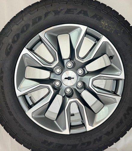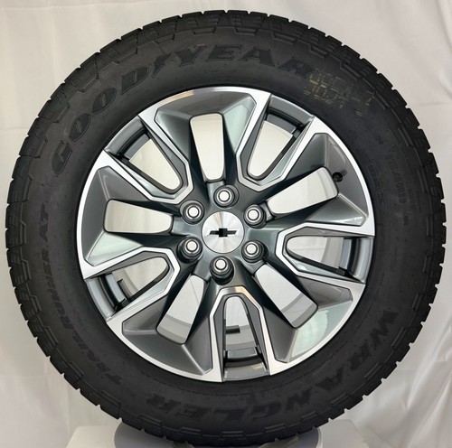 Set Of Four New Takeoff Chevy Silverado Gunmetal And Machine 20" Wheels With 275/60R20 Goodyear Wrangler TrailRunner All Terrain Tires. These were removed from a new vehicle to install larger wheels and tires with less than 25 miles.