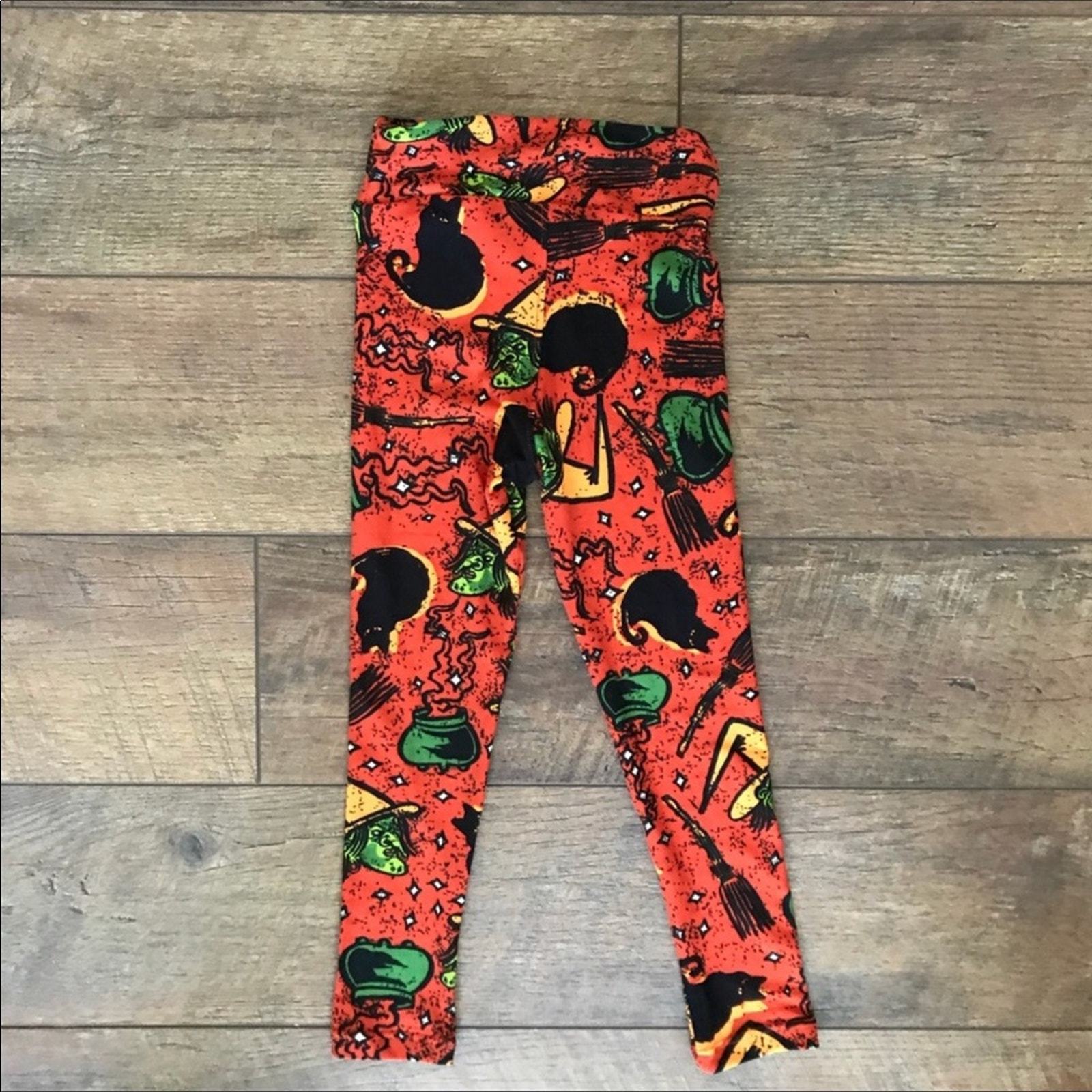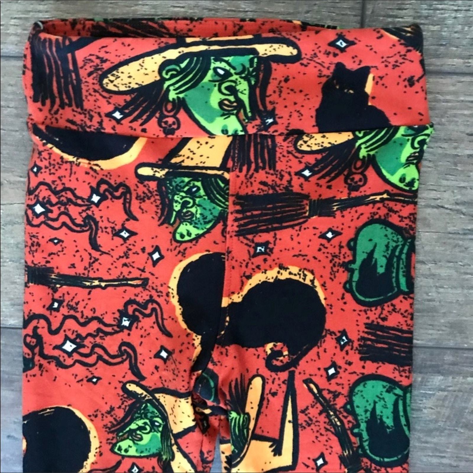 LuLaRoe orange black cats and witches Halloween print girls leggings.