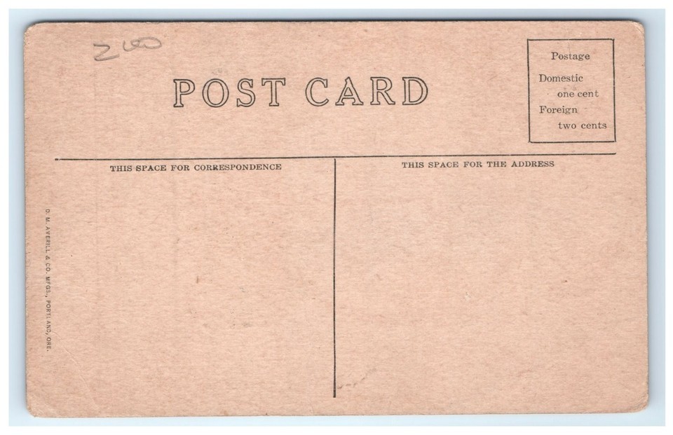 Published by D.M. Averill Co., Portland, Oregon, this postcard is an original printed lithograph typical of early 20th-century American humor postcards. The back side shows standard divided postcard format with postage rates listed as one cent domestic and two cents foreign, suggesting it dates to the 1910s or 1920s era. The card's charming chrome features and distinct illustration style make it a collectible item for enthusiasts of Western Americana, vintage humor art, and early postcard history.