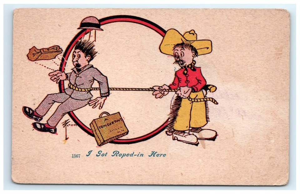 This vintage postcard features a humorous cartoon lithograph depicting a cowboy roping a surprised man in a suit labeled "A Tenderfoot." The scene captures classic Western humor, contrasting the rugged cowboy in a large hat, red shirt, and chaps with the startled businessman who is mid-air with his hat flying off. The caption below the illustration reads, "I Got Roped-in Here," adding a playful narrative to the image. The postcard is numbered 1567, indicating it is part of a series.