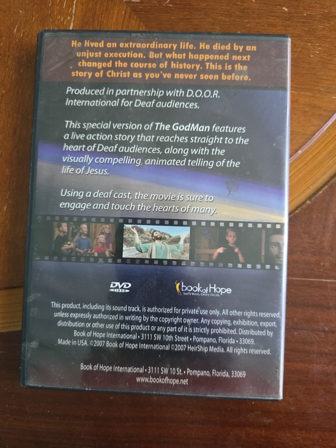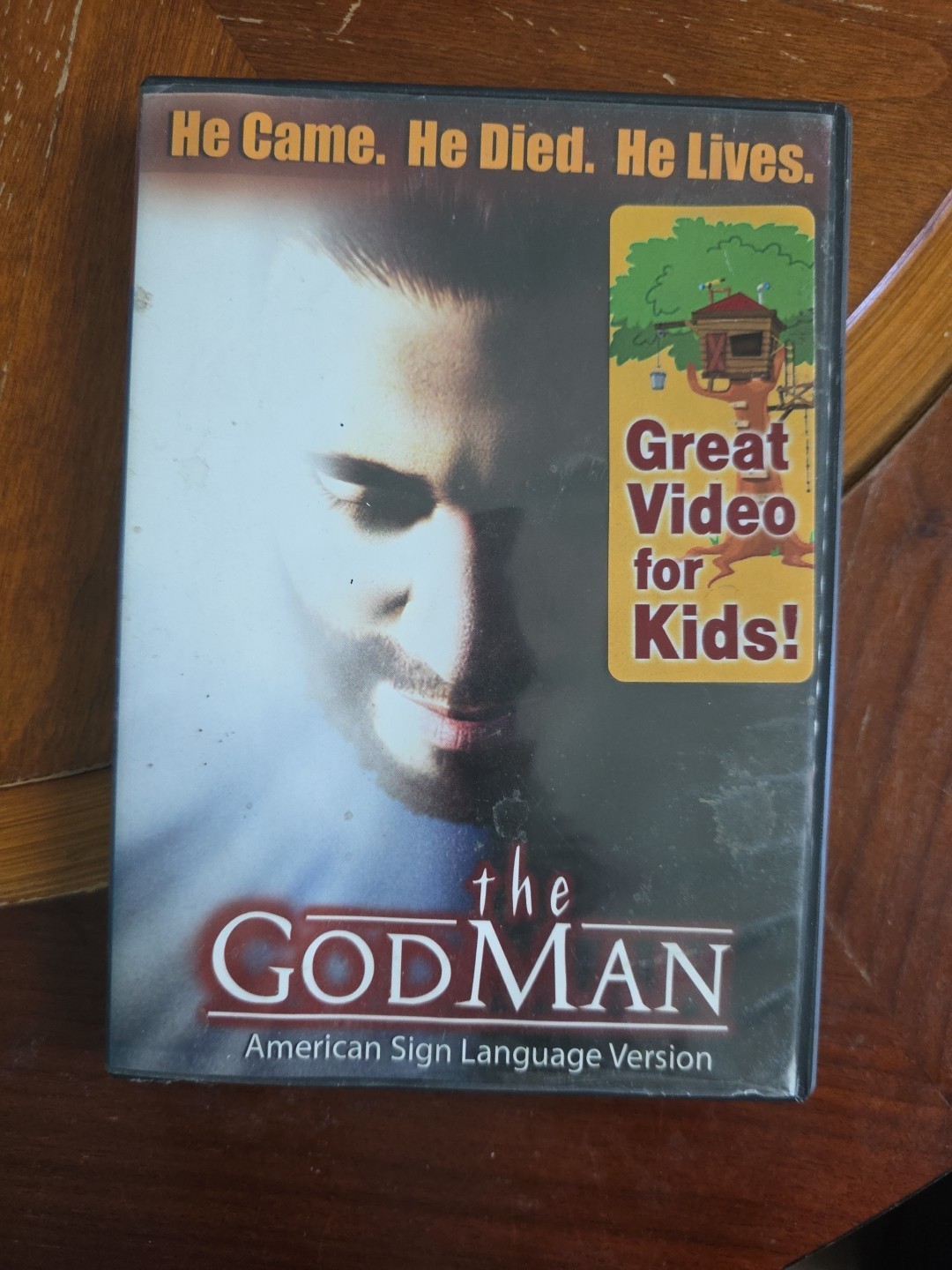 "The God Man: He Came. He Died. He Lives." is a DVD movie presented in American Sign Language (ASL). The film follows a story centered around a character known as The God Man, exploring themes of faith, sacrifice, and redemption. With a focus on visual storytelling and utilizing ASL as the primary language, viewers can experience the narrative in a unique and accessible way. The DVD is formatted for NTSC signal standard and is region coded for US and Canada players.