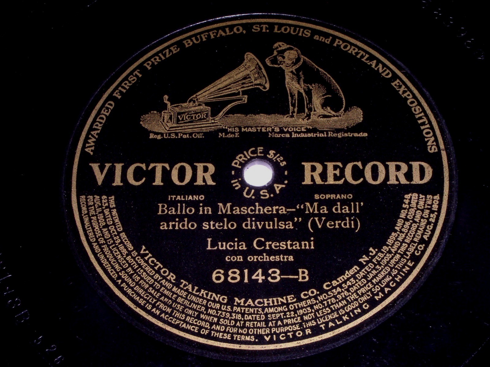 This is vintage 33 1/3 Rpm phonograph record by Giacomelli Mileri Martinez Patti entitled, "Ballo in Mascher- Della citta all' occaso (Verdi)". Flipside: Lucia Crestani "Ballo in Maschera Ma dall arido stelo divulsa (Verdi)". Record label: Victor 68143.