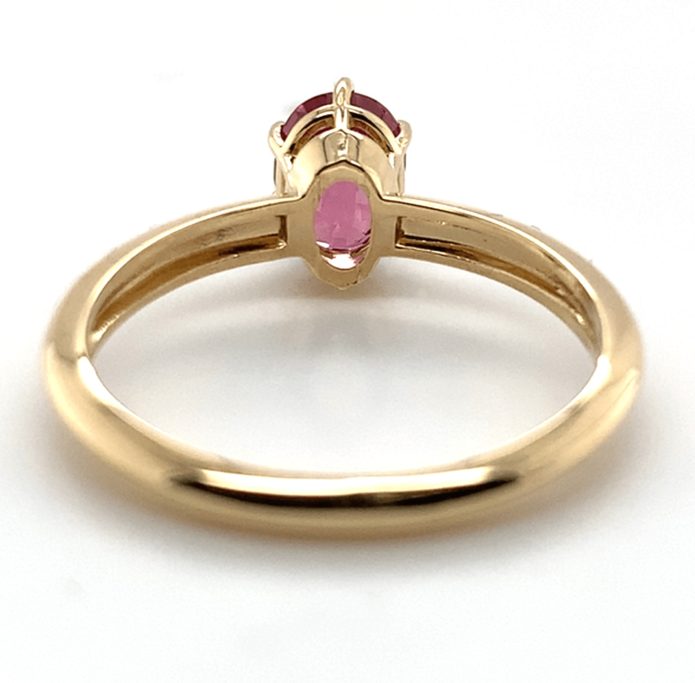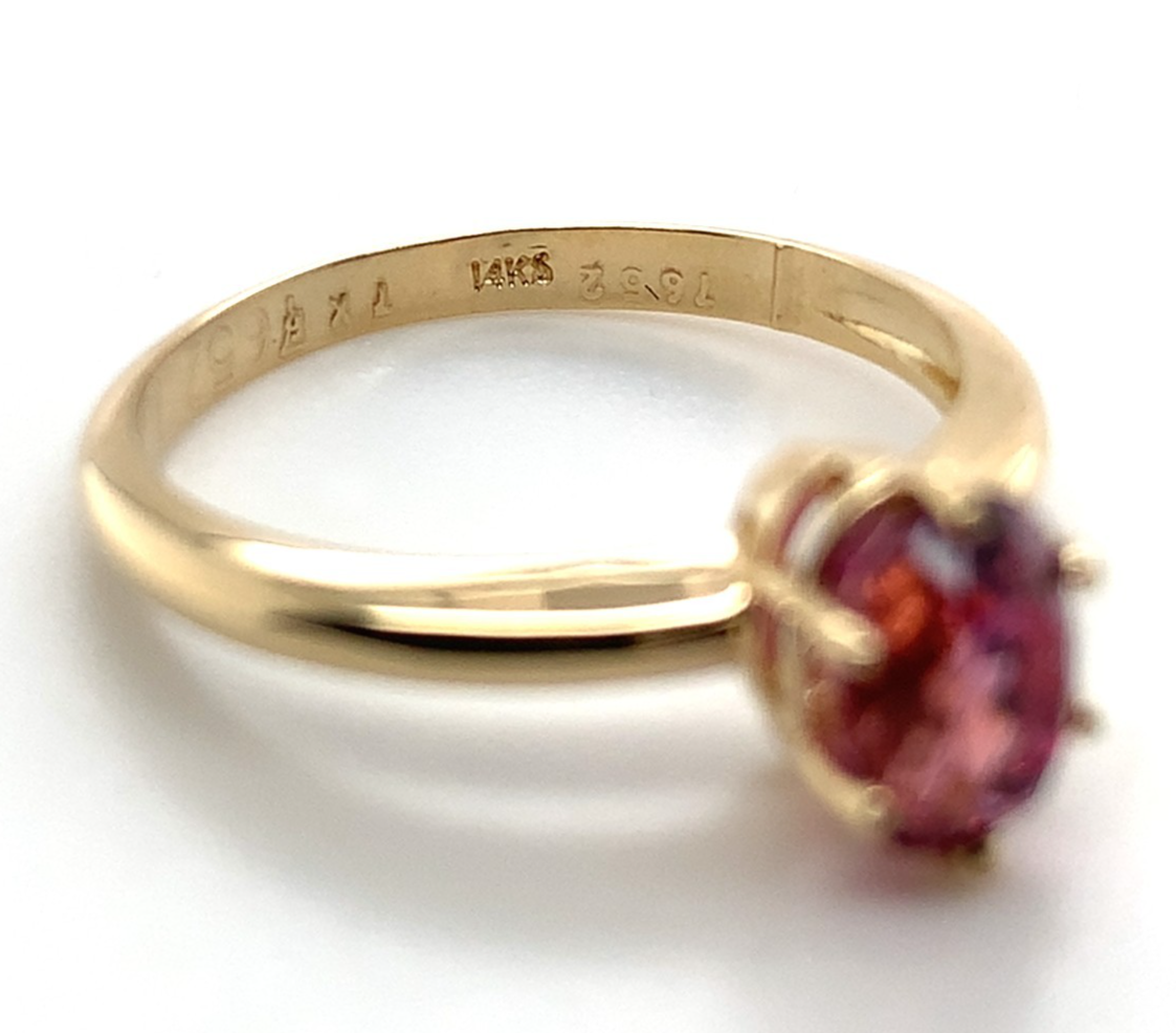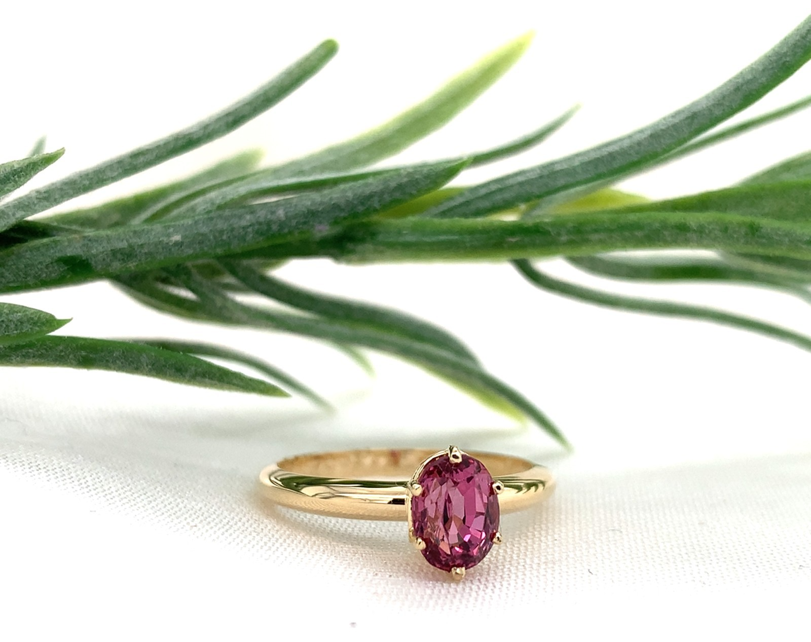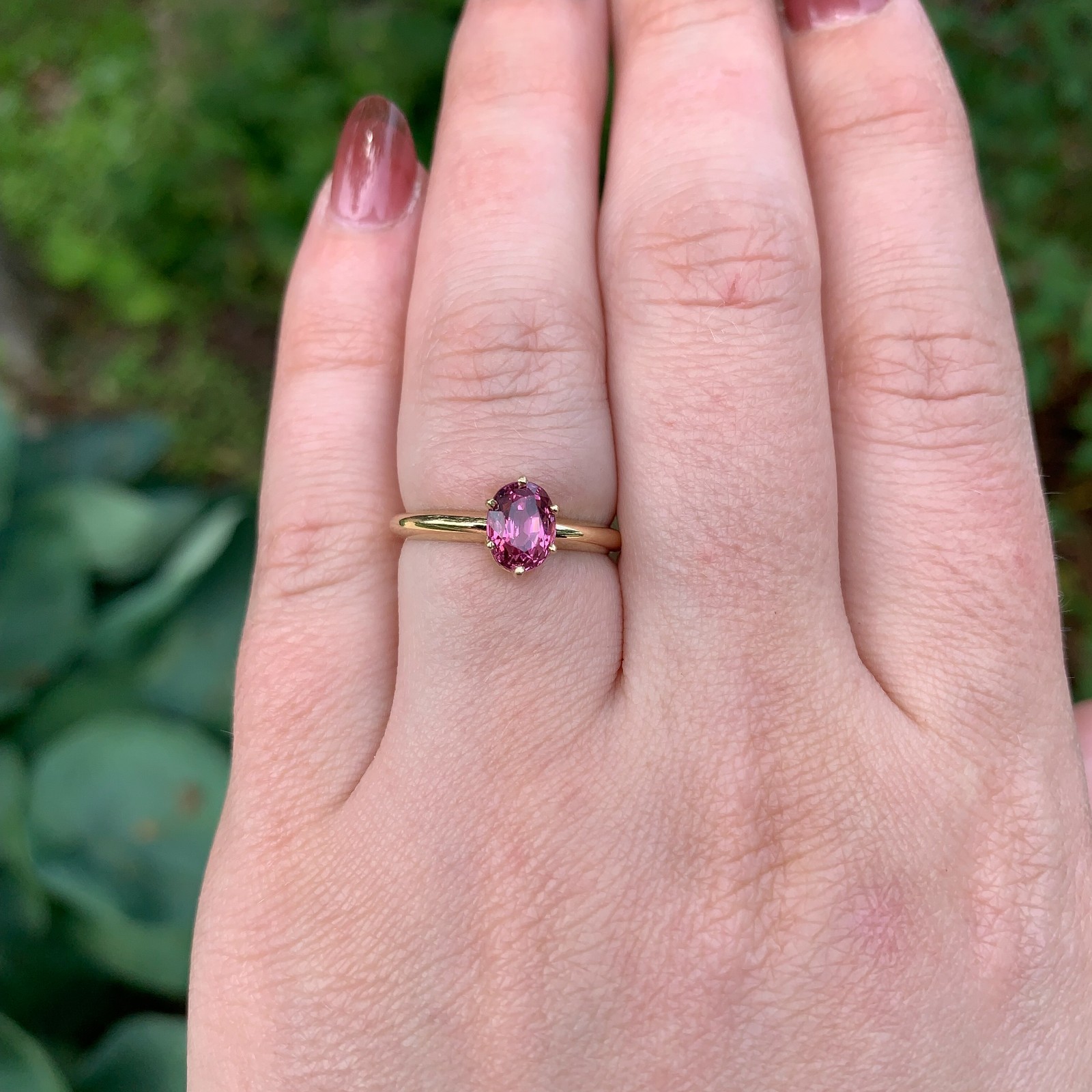 14k yellow gold pink spinel ring. The oval pink natural spinel weighs 1.36 carats and measures about 7mm x 5mm. The ring fits a size 6.5 finger. It weighs 1.44 dwt., and is new. Lovely!