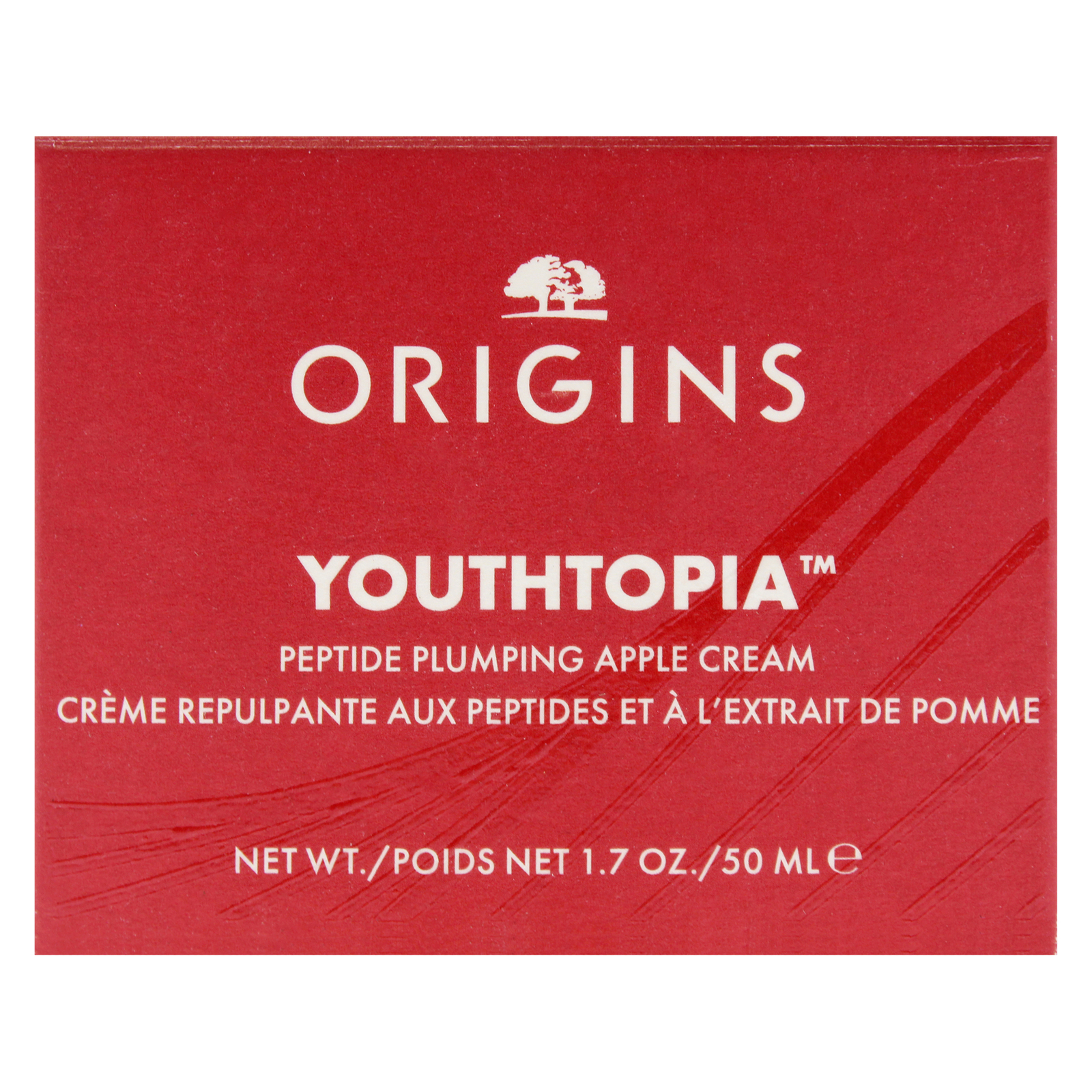 Origins' Youthtopia Plumping Apple Face Moisturizer with Peptides plumps skin with moisture, helps maintain skin's vitality, strengthens skin's barrier and minimizes the look of pores. Skin feels bouncy and looks plump and healthy.