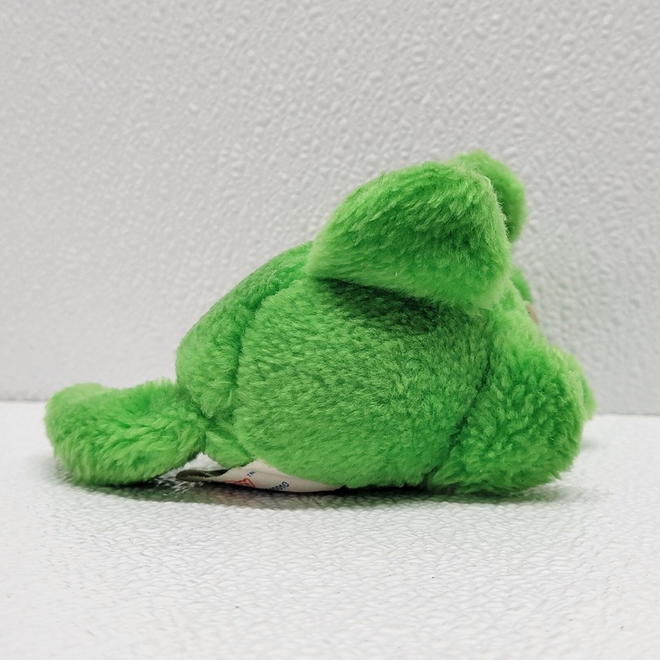 Vintage American Greetings Amtoy 1981 Green Dinosaur Plush 5.5" Tye Dye Feet. Crushed nut shells stuffing. Made in Korea. Images show actual plush that will ship.