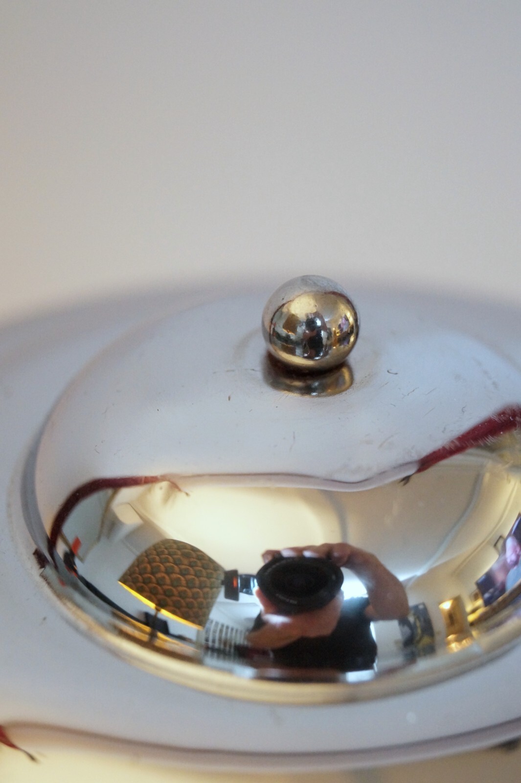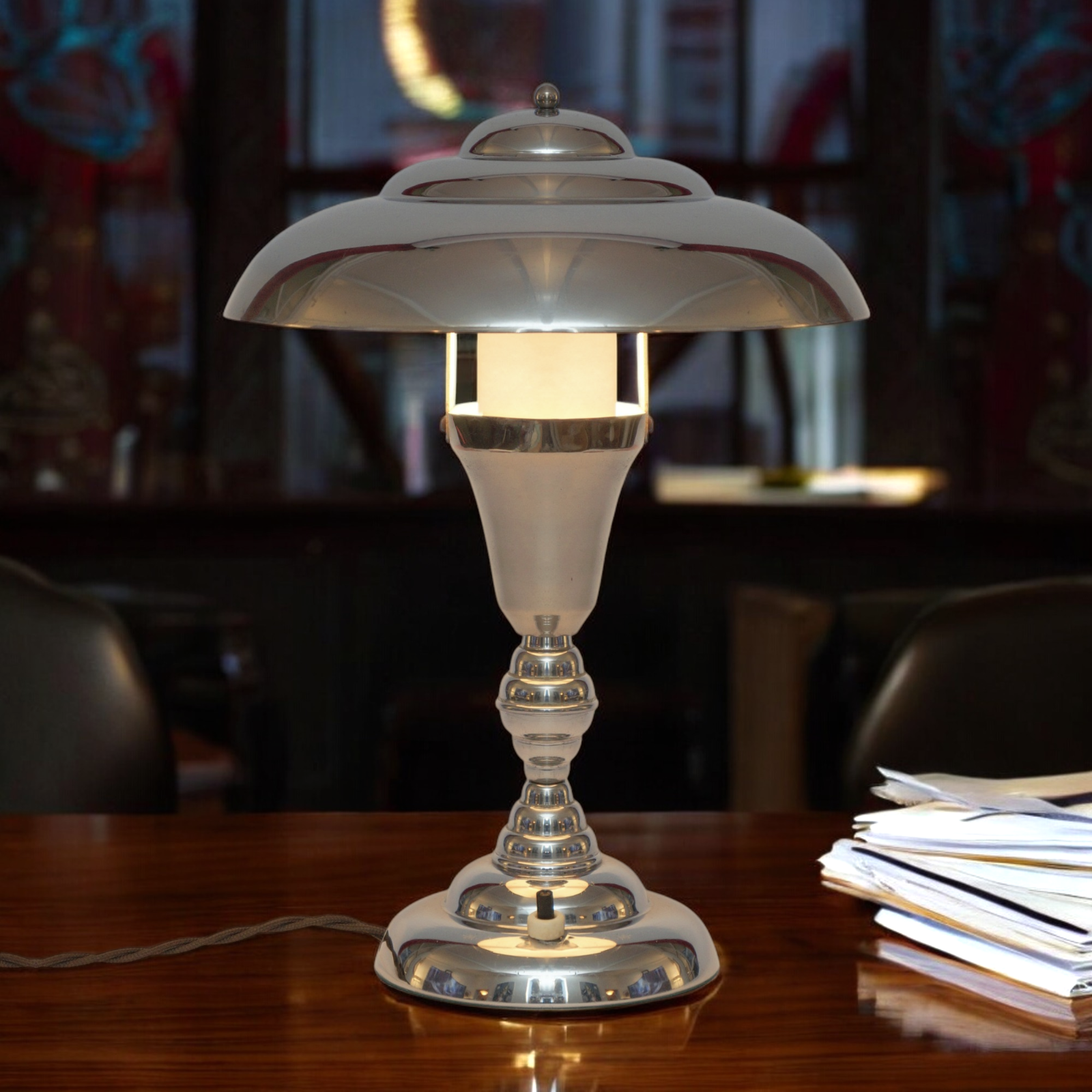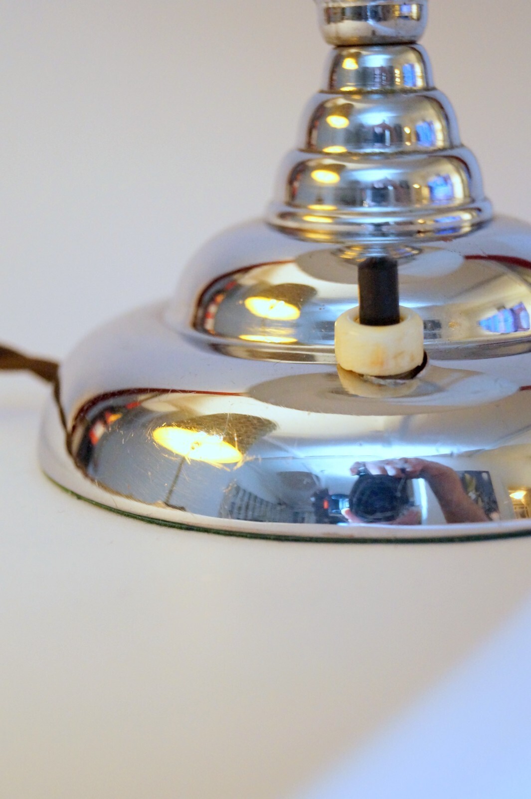 Original Art Deco desk lamp "Benrath" from chrome, made in France in the 1920s. This small table lamp with a diameter of 22 cm and a height of 30 cm impresses with its elegant design in the style of the Art Deco. The ancient charm is underlined by the finish in antique chrome and the use of high -quality materials such as cast iron, brass and stainless steel. In connection with the swiveling screen, the light bulb E14 ensures pleasant lighting in silver and white. Perfect for lovers of vintage design and collector of unique pieces.