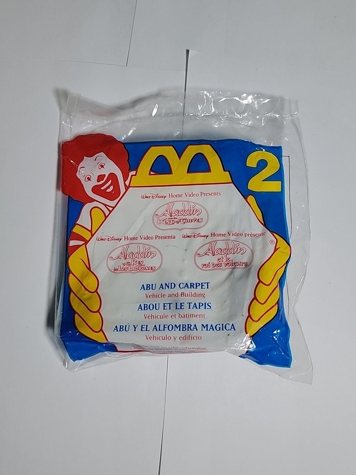 This is a 1996 McDonald's Happy Meal toy featuring Disney's Aladdin characters Abu and Carpet. The toy is part of a set of individual pieces and is not a custom bundle. It is suitable for children aged 3 and up, with an age range of 3-4 years and 8-11 years. The toy is from the popular Character Family of Aladdin and was made in China for McDonald's restaurants. The brand is Disney, and the specific toy is number 2 in the series.