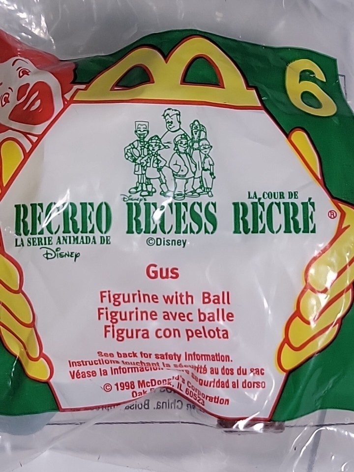 The product is a vintage McDonald's Happy Meal toy featuring a Disney character from the show "Recess," specifically "Gus" #6. The toy is new and sealed, making it a collectible item for fans of both Disney and McDonald's nostalgic memorabilia. This item likely appeals to those interested in vintage toys, Disney merchandise, and fast food premium collectibles.