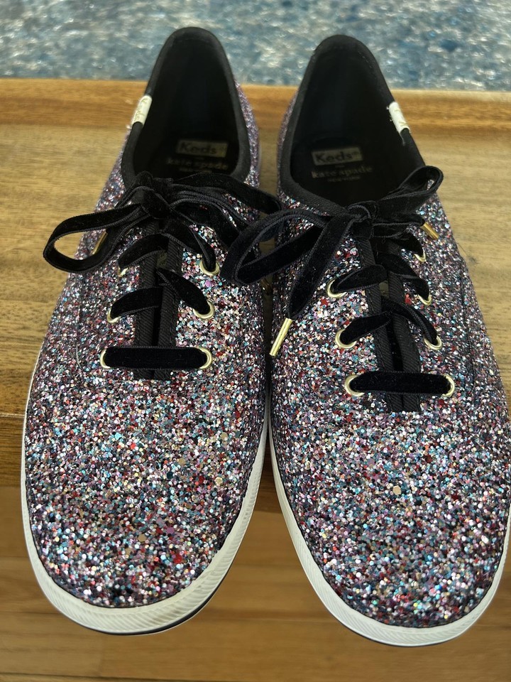 Step out in style with these stunning Keds x Kate Spade Glitter Sneakers. Perfect for adding a touch of sparkle to any outfit, these shoes feature a vibrant glittery upper that gleams beautifully in light. - Colorful glitter design for a playful look - Comfortable lace-up style for easy wear - Classic rubber sole for stability and support - Ideal for casual outings and special occasions - A trendy collaboration from two beloved brands, Keds and Kate Spade.