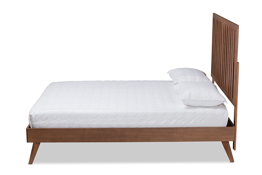 Create a cozy scene in your bedroom with the robust style of the Rowanne bed. Made in Malaysia, the Rowanne is constructed from walnut brown finished wood that easily coordinates with any color palette. Its slatted headboard allows light to flow more easily throughout the room, providing a more open feel in tight spaces. Requiring assembly, the Rowanne utilizes wood slats for mattress support, eliminating the need for a box spring. Angled legs lend mid-century charm, making the Rowanne bed a fantastic addition to any bedroom.