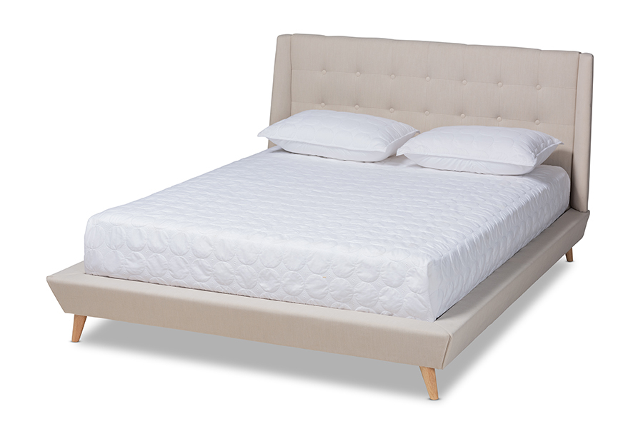 Bask in mid-century glory with the Powell bed. Built with a sturdy wood frame, the Powell is upholstered in a soft, foam filled polyester fabric that provides ample comfort for you to rest against. The wingback headboard displays button tufting for a touch of refinement and visual depth. Displaying the hallmarks of mid-century modern design, the Powell features a low platform elevated by oak finished angled legs. The Powell bed is made in Malaysia and requires assembly.