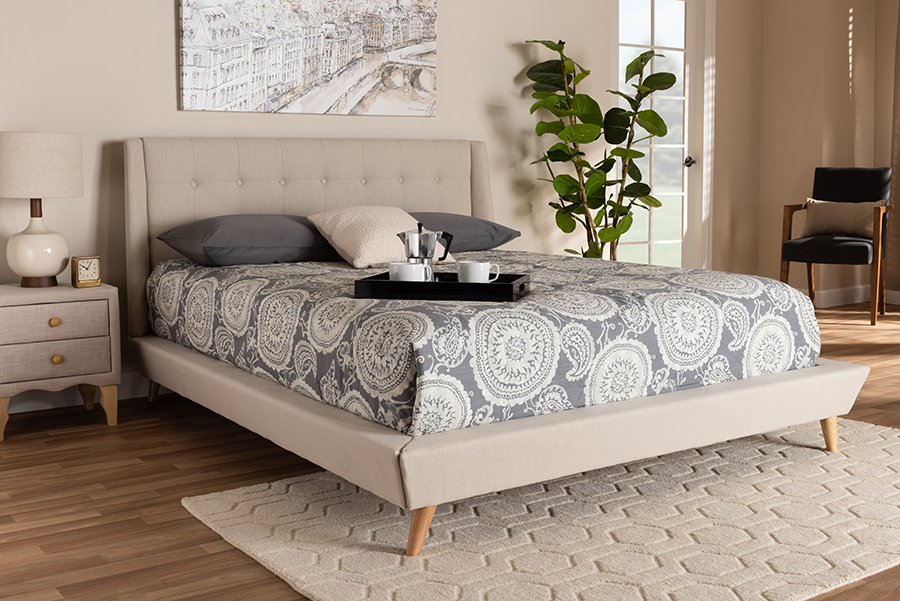 Powell Beige Fabric Upholstered King Size Wingback Platform Bed