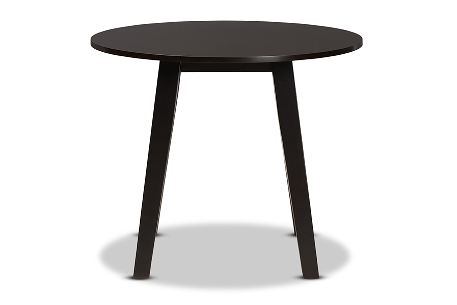 Featuring a modern profile and sleek finish, the Thornton dining table brings style to any dining space. Made in Malaysia, the Thornton is built from sturdy wood and comfortably seats up to four. A dark brown finish and round tabletop give the table a contemporary look while also providing ample elbow room for each member of the table. Splayed legs create a chic profile from any angle. Requiring assembly, the Thornton dining table is well suited for both casual and formal dining.