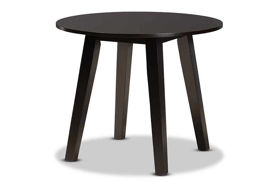 Features: Constructed from rubberwood, MDF wood, and LVL Walnut brown finish seats up to four (4) Round tabletop Splayed legs Solid and Quality Construction Set Includes: One (1) Dining Table