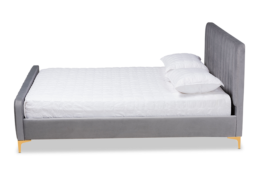 Lafoy Light Gray Velvet Fabric Gold Finished Queen Size Platform Bed