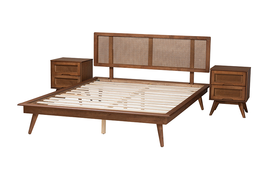 Features: Constructed from rubberwood, MDF wood, and LVL Walnut brown finish Inset drawer handles Woven synthetic rattan embellishments Wood slats eliminate the need for a box spring Angled legs Set Includes: One (1) King Size Bed Frame; One (1) King Size Headboard; Two (2) Nightstands