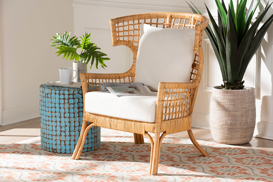 Features: Constructed from rubberwood, MDF wood, and LVL Walnut brown finish Lattice rattan design Removable cushions padded with foam and upholstered in fabric Flared armrests Timeless Pieces That Elevate Any Spaces Set Includes: One (1) Chair