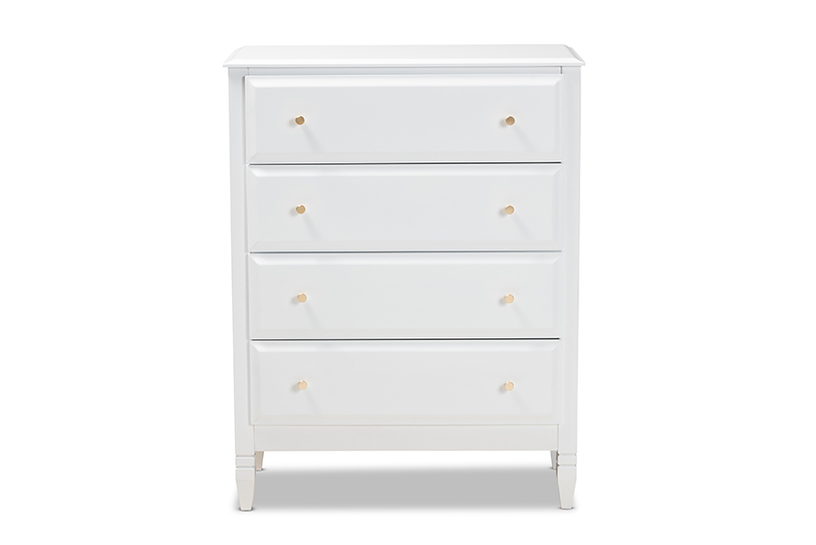A classic silhouette receives a glamorous update in the Lea chest. Made in Malaysia, this wooden chest displays a polished white finish that brightens any space. The tabletop is well suited for a lamp and trinkets, while four drawers provide ample storage space for clothing and linens. Each drawer is adorned with a striking gold-tone knob that adds a touch of glamour. Inspired by traditional design, the Lea features tapered feet with recessed detailing. Requiring assembly, the Lea chest strikes the optimal balance between classic and contemporary for a look that enhances any bedroom.