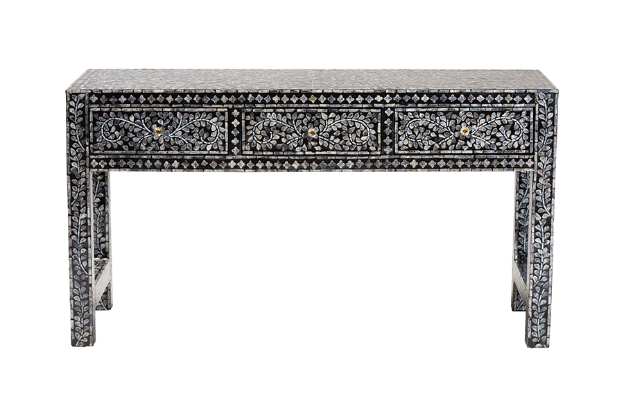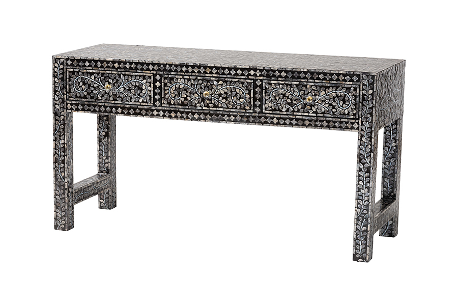 Enliven the ambiance of your space with the vivid flair of the Jules console table. Made in Vietnam, this coastal piece consists of a sturdy wood frame intricately encased in natural Capiz shell showcasing a beautiful floral design. Three drawers offer superb storage for household essentials while reserving the tabletop as an enchanting display area. The Jules will arrive fully assembled and is fitted with faux crystal knobs for an extra dose of glamorous fashion. Evoking an air of elegant poise, the Jules console table ornaments any setting.