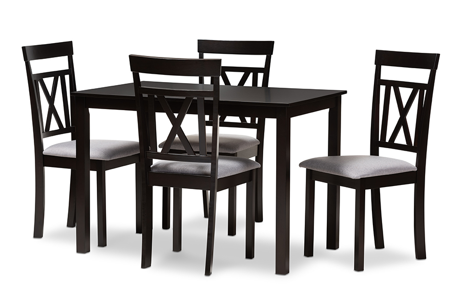 Our Milagra modern and contemporary 5-piece dining set celebrates simplicity by combining timeless and contemporary elements. The chairs high, X-back design offers comfort and grace. Dark-brown, wenge-finished wood matches perfectly with Grayfabric padded seats. Featuring tapered legs, the Milagra is the essence of modern design. The minimalist yet sophisticated table is finished in a chic dark brown. Made in Malaysia, the Milagra dining chair requires assembly.
