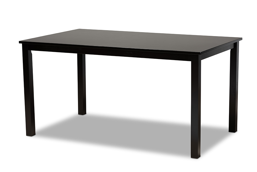 Features: Constructed from rubberwood, MDF wood, and LVL Walnut brown finish Espresso brown finish Upholstered in polyester fabric and padded with foam Cut-out back design Solid and Quality Construction Set Includes: One (1) Dining Table; Six (6) Dining Chairs