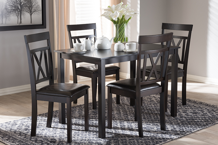 Features: Constructed from rubberwood, MDF wood, and LVL Walnut brown finish Solid rubberwood construction with mdf table top Dark brown finishing Dining table is with shaker legs Upholstered seat in dark brown faux leather Set Includes: One (1) Table; Four (4) Dining Chairs