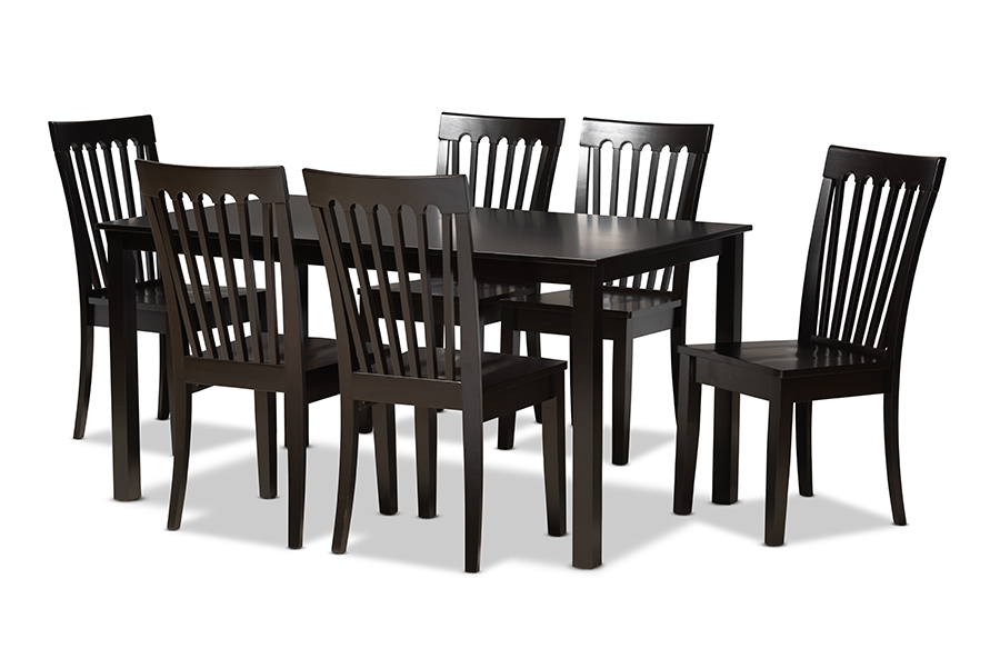 Features: Constructed from rubberwood, MDF wood, and LVL Walnut brown finish Dark brown finish Cut-out backrest Rectangular tabletop Solid and Quality Construction Set Includes: One (1) Table; Six (6) Dining Chairs