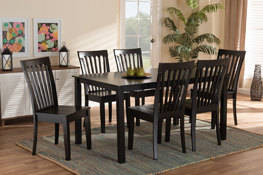 Timeless design merges with modern comfort to create the Cora dining set. Made in Malaysia, this dining set includes six chairs and one table constructed from dark brown finished wood. An optimal balance of comfort and style, the chairs feature a smooth scoop seat, while the backrests display a striking cut-out design for enhanced visual appeal. Requiring assembly, the rectangular tabletop provides ample elbow room for each member at the table. Ideal for hosting formal dinner parties or casual meals, the Cora dining set is sure to enhance any dining experience.