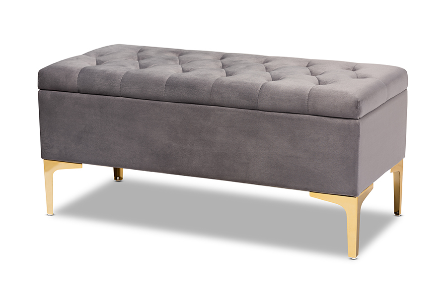 Ayu Gray Velvet Fabric Upholstered Gold Finished Button Tufted Storage Ottoman