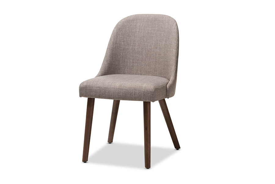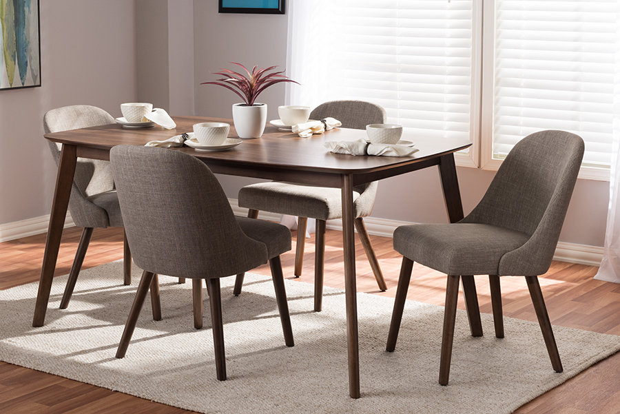 The gentle curves and minimalist style of the Catia five-piece dining set make it easy to coordinate in casual and formal settings. The set's mid-century modern-inspired design is apparent in the curved, slightly arched chairbacks. The Catia is built to last with solid rubberwood construction. The chair features chic, light Grayfabric upholstery and a comfortable, foam-padded seat. The table of the Catia dining set has a rounded edge design, encouraging a casual, retro vibe. The table and chair legs feature a warm, walnut-finish, with shapely angled legs. This dining set will add a touch of modern flair to your dining room, breakfast nook, or rec room. Made in Malaysia, the Catia requires assembly.