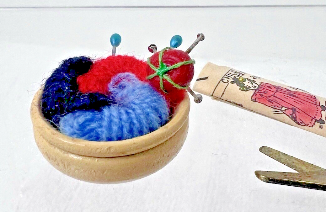 3 PC Dollhouse Miniature Sewing Scissors Pattern Knitting Yarn Bowl Pincushion