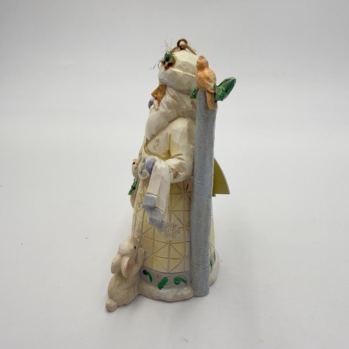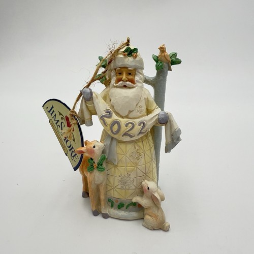This Jim Shore Heartwood Creek ornament features a Santa Claus character in a White Woodland theme, perfect for Christmas. The small ornament is 4 inches tall and part of the 2022 collection. It is an original Jim Shore Enesco creation, made in China. The set includes one ornament beautifully designed in the Jim Shore style, ideal for adult collectors.