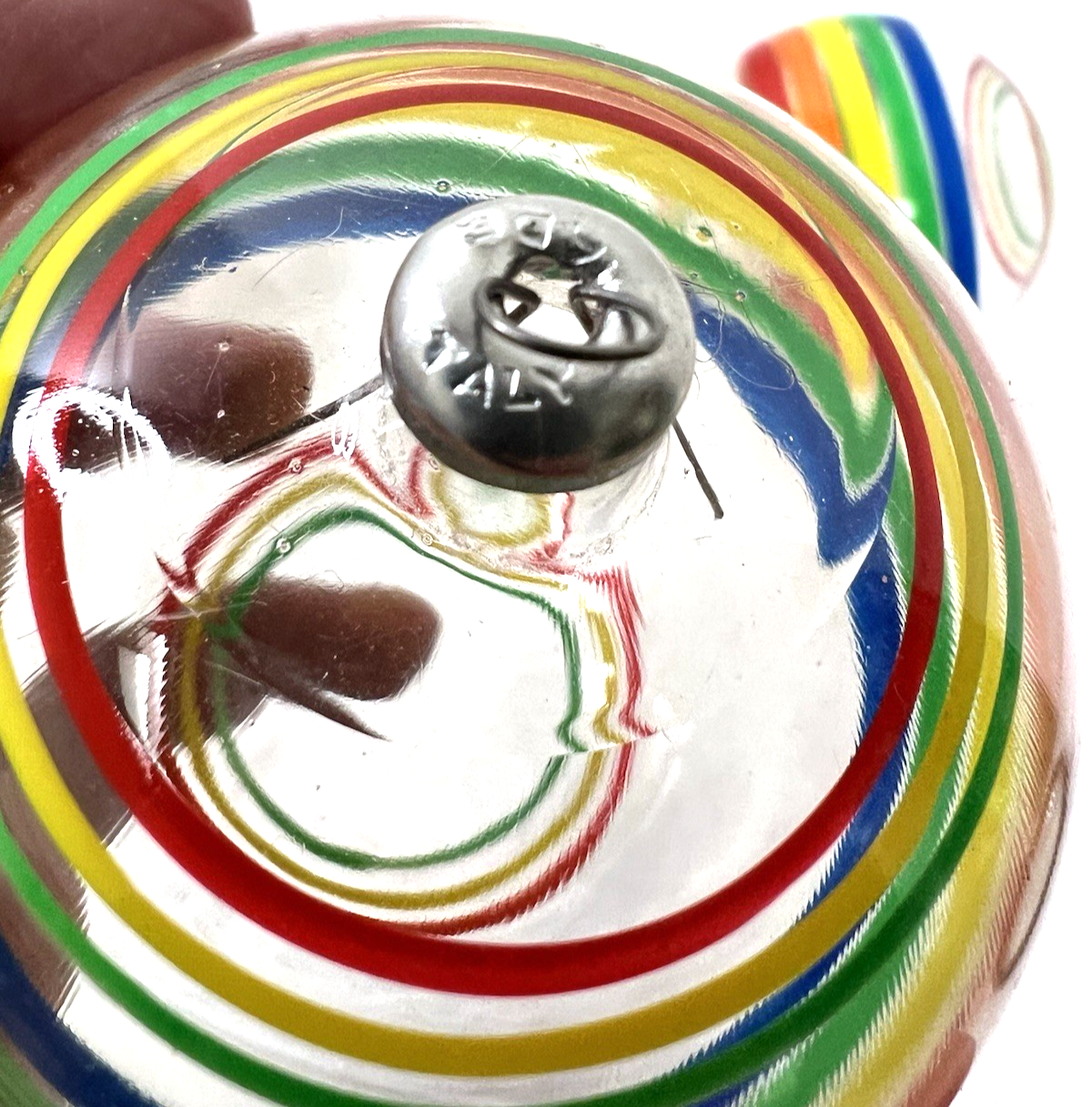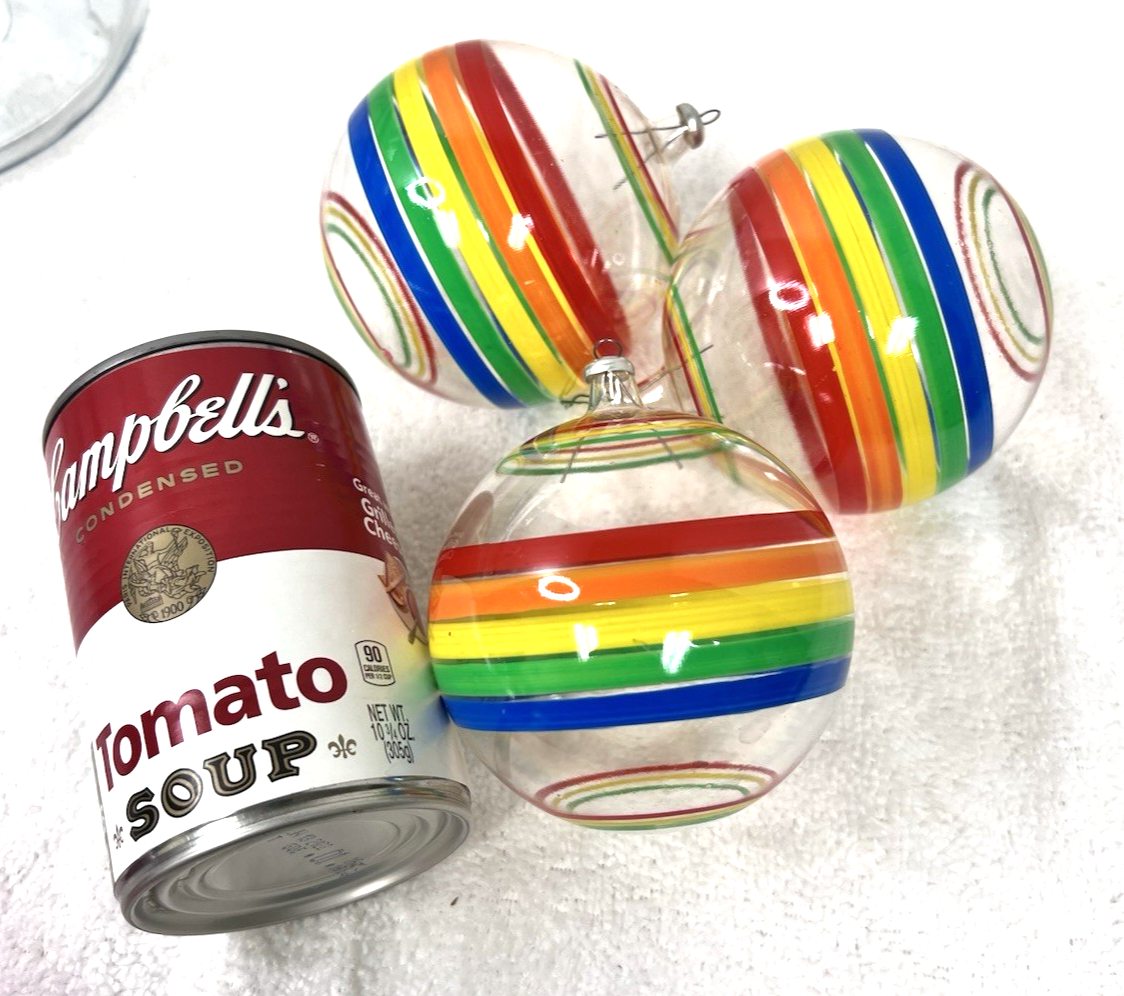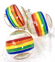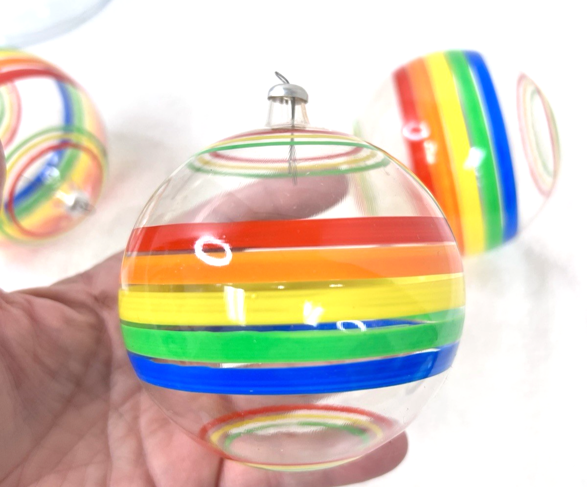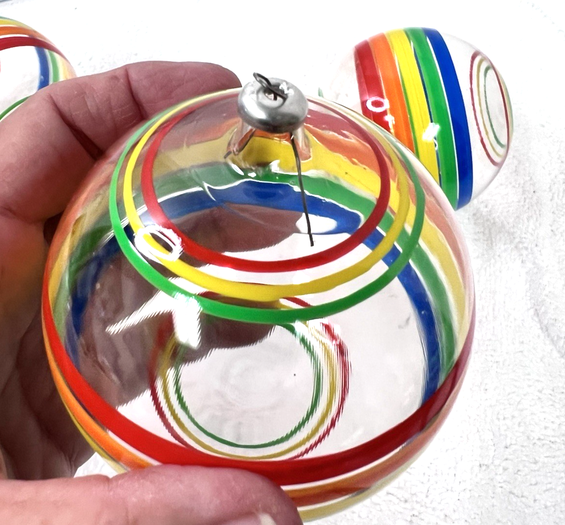 3 Vintage Italian Rainbow Striped Glass Christmas Ball Ornaments Primary Colors about 3 inches wide IN great shape but on the bottom row of rings a couple have paint "drag marks" just check the last pictures Each will be boxed so they travel safe to you!