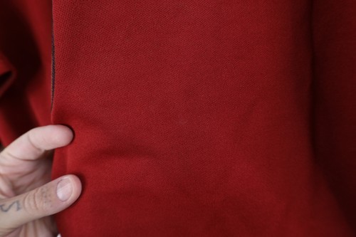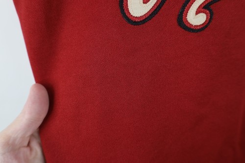 Dark spots/blemishes front, back. Designs distressed. Blemishes arms, collar discolored. Pilling. Signature on back. Made in USA. No COA