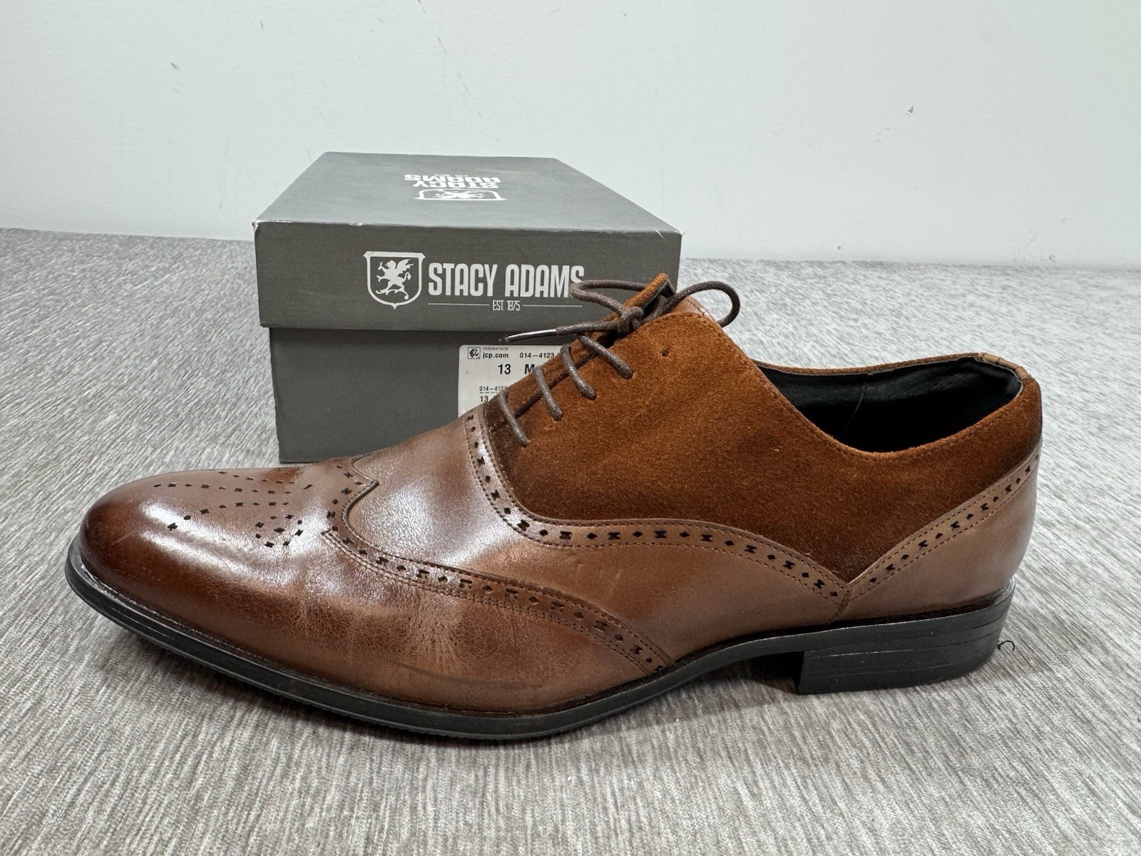 For sale is a Stacy Adams Stanbury Dress Shoes Mens 13 Cognac Wing Tip Brown Leather Suede