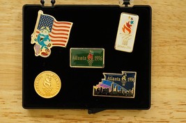 Vintage 1996 Atlanta Olympic Games Flag Mascot Torch Souvenir Pins LE Box Set. Crisp excellent condition. Pins 1-1.25" tall